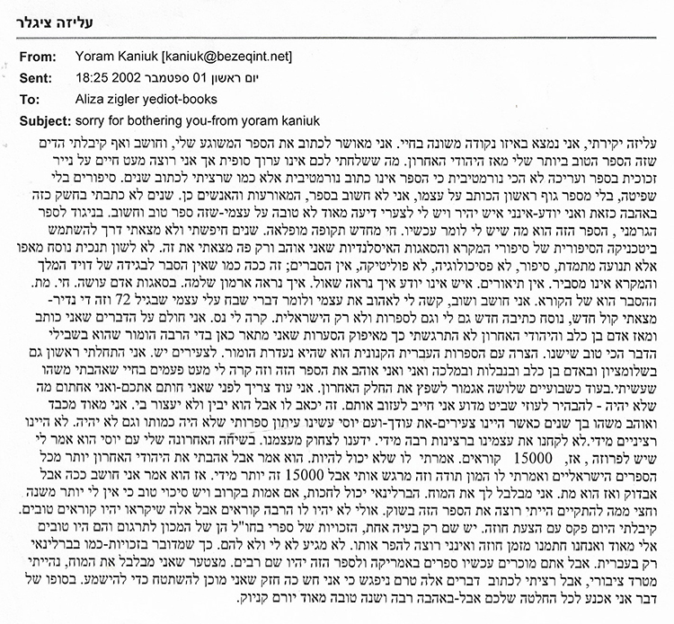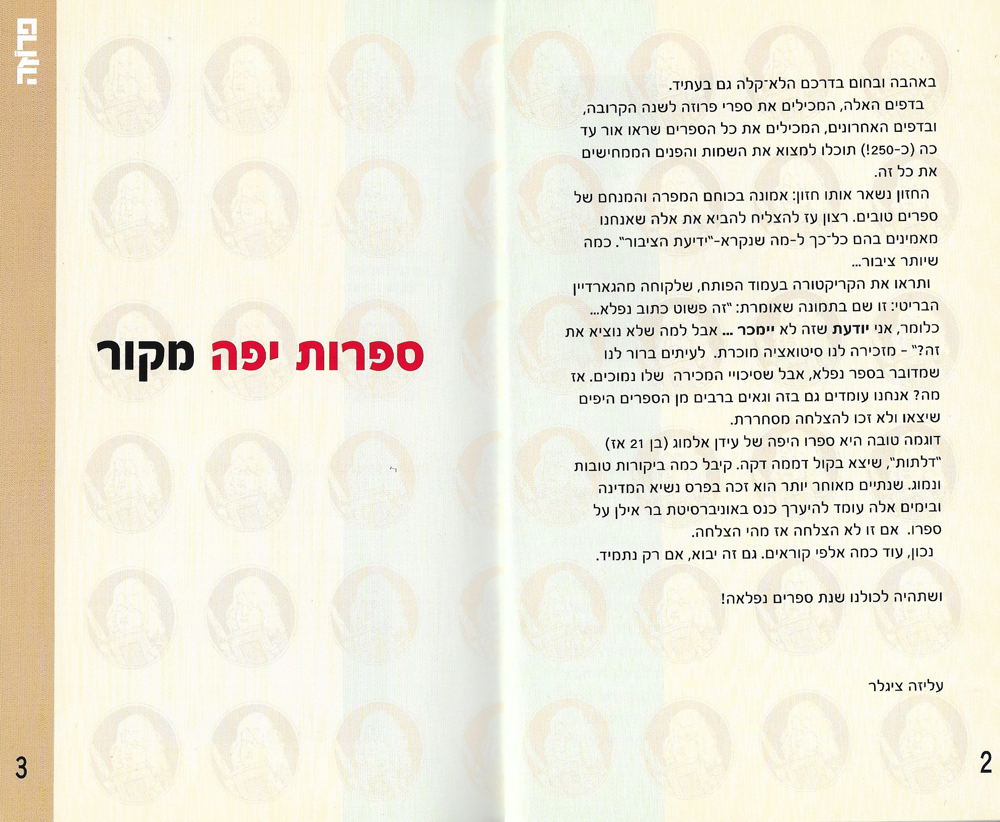 א. איך לפני שניים וחצי עשורים הענקת לי במשרדך ליד מקווה ישראל מקווה של מים מתוקים – כשפינית לי מקום מכובד כעורכת ספרים במשכל. הענקת לי ולבנותיי יכולת לשרוד כלכלית על פני שנים במקצוע שאין לי מלבדו. אז תודה לך. היה לנו כיף ביחד!