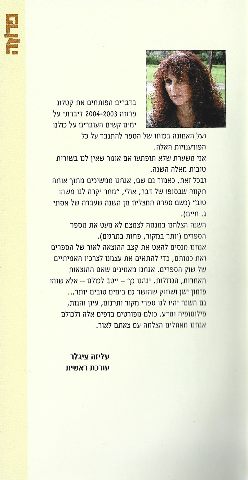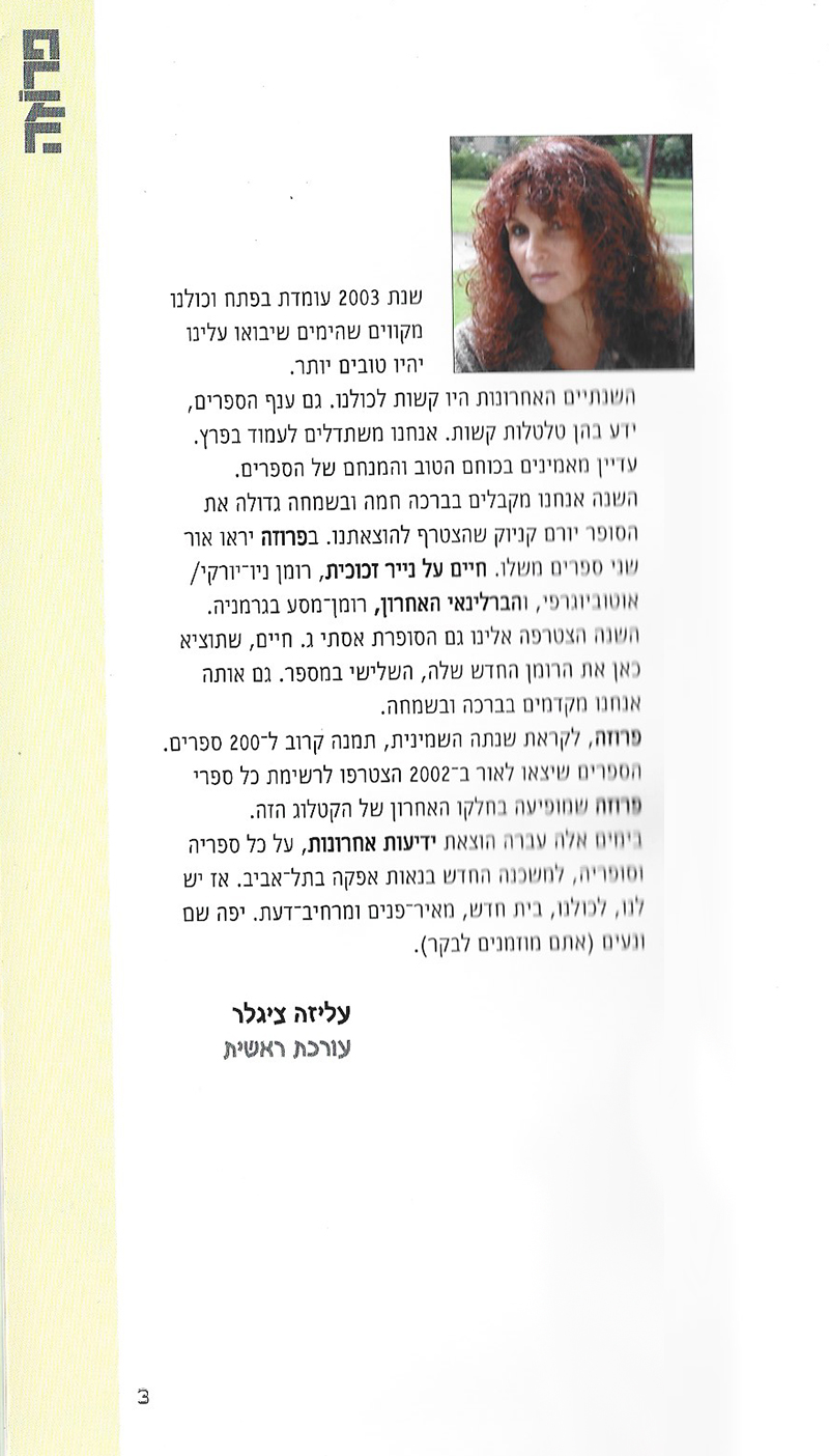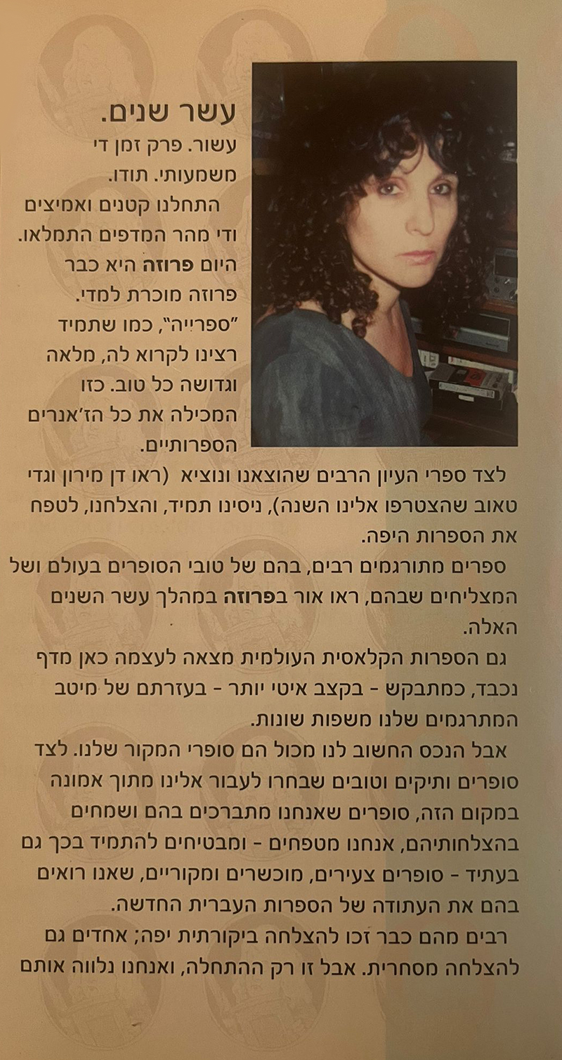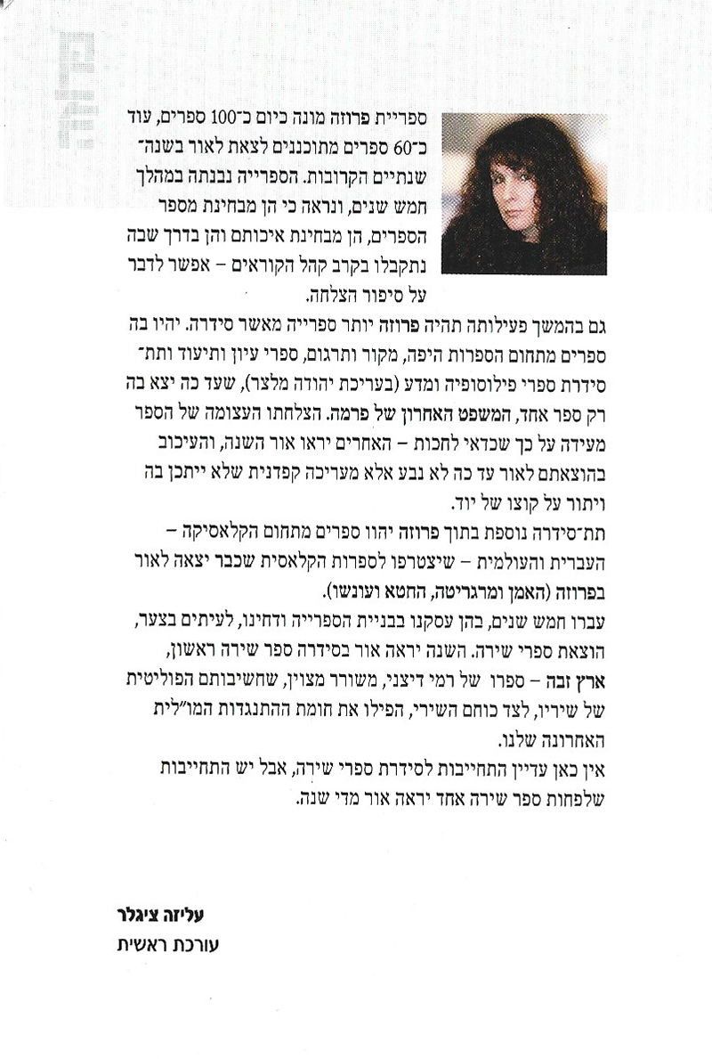 במסגרת תפקידי כעורכת הראשית של הוצאת ידיעות אחרונות (לימים – ידיעות ספרים) ייסדתי וערכתי את הסידרה בעריכתי, עם הלוגו של כתב העת לספרות ואמנות שניתן לנו באדיבות נעמי קריים, אלמנתו של יוסי, לזכרו.