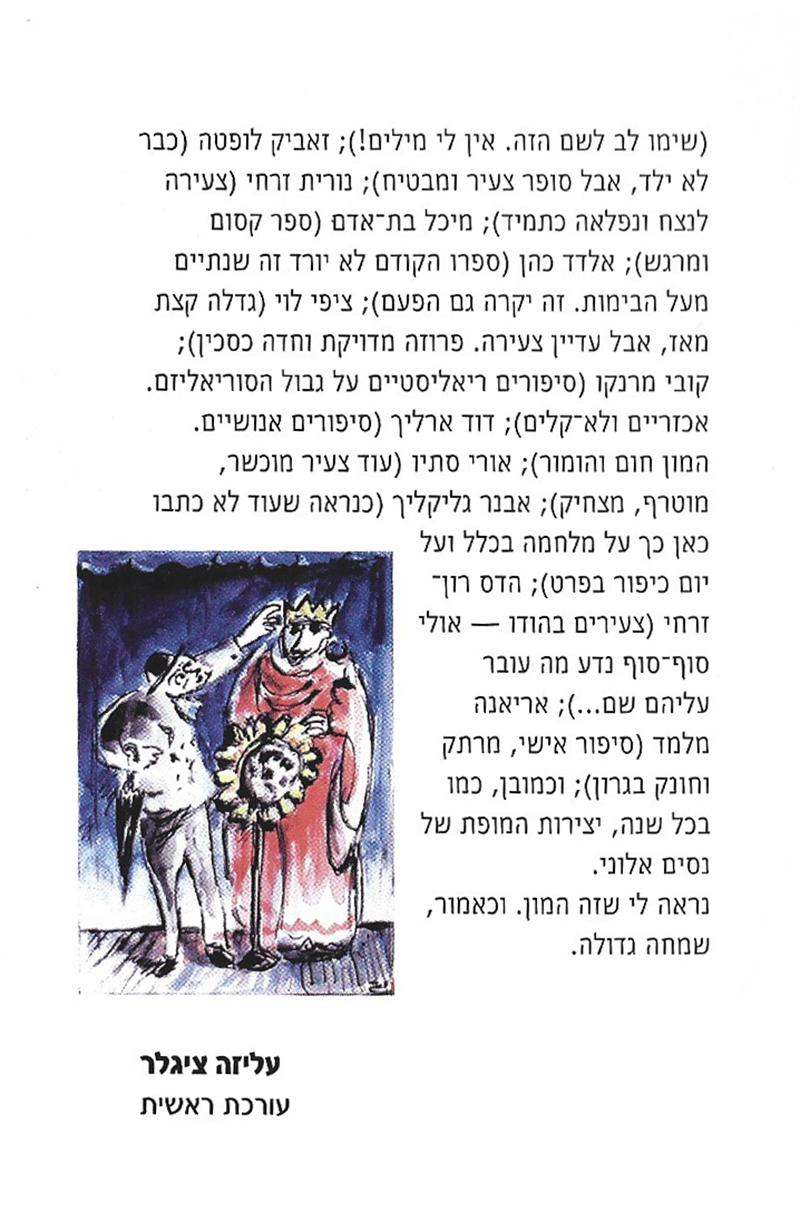 עליזה ציגלר היא לא סתם עורכת. היא מהאנשים הלא רבים שאפשר בקלות להוסיף למקצוע שלהם את התואר "אגדית", וזה ייראה הכי טבעי בעולם. עליזה היא מישהי שהטביעה חותם עמוק בתרבות הישראלית, ב"פרוזה", ב"ידיעות ספרים", ובעשור האחרון ב"ליריקה", מתוך מחויבות אמיתית לאיכות וליצירה, ועבדה עם ענקים כמו נסים אלוני, יורם קניוק, נורית זרחי ועוד ועוד. ולמרות כל הרקורד, כשעובדים איתה, פוגשים בראש ובראשונה אשת מקצוע צנועה, תכליתית ורגישה, שמה שהכי חשוב לה שהספר ייצא הכי טוב. זאת זכות לעבוד עם עליזה.