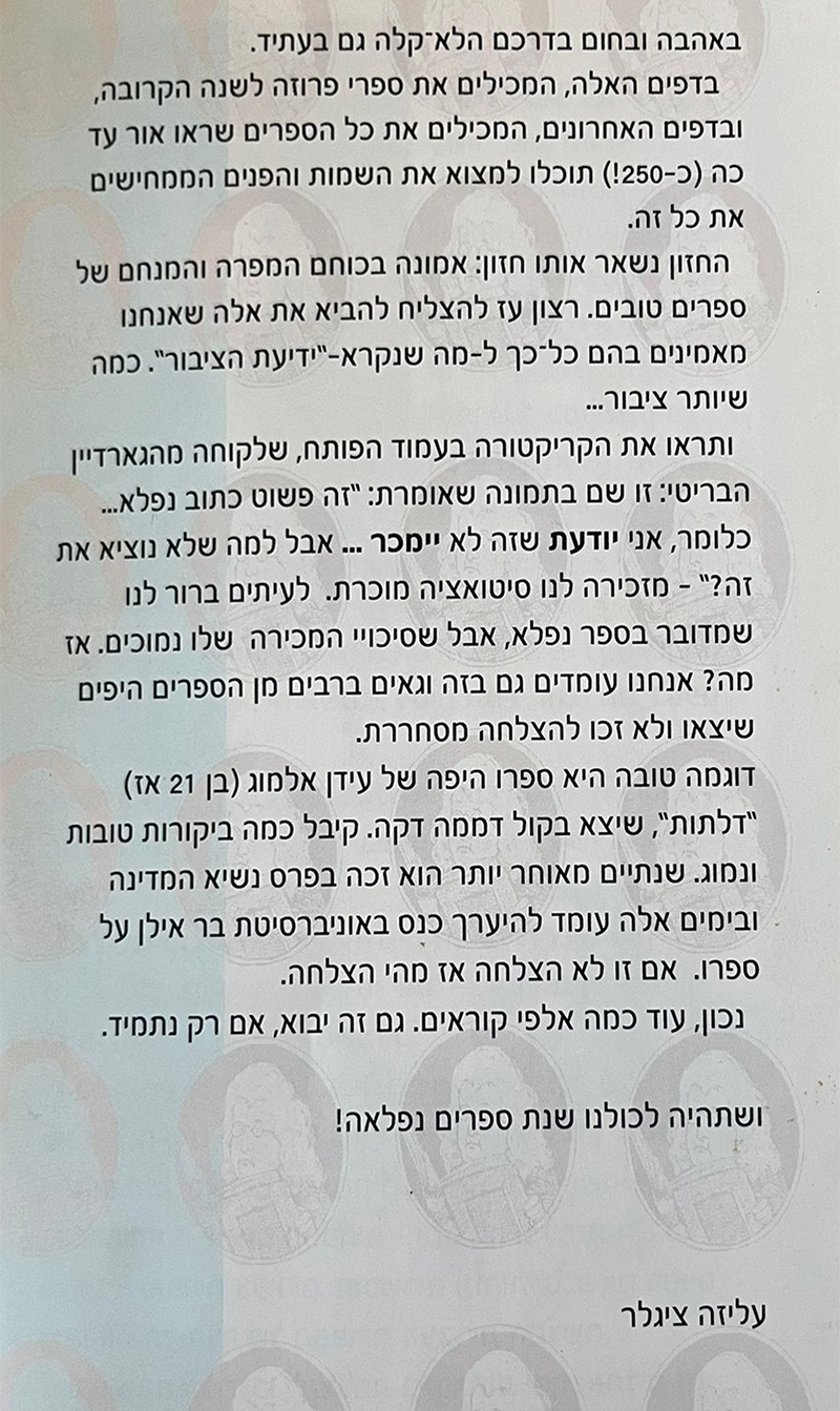 בקיצור, במשפחת הספר עליזה ציגלר יושבת בראש השולחן.